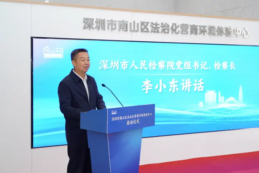 深圳市人民检察院党组书记、检察长李小东发表讲话。他指出,此次全新升级建设深圳市南山区法治化营商环境体验中心,是南山区检察院聚焦企业需求、拓展服务网络、融合法治资源的创新举措,相信通过促进 “检察+企业”多维互动、体现“检察+科技”深度融合、打造“检察+文化”宣教阵地,该中心将为优化南山营商环境、推动经济高质量发展注入新的动力,并希望南山区检察院紧紧锚定创建中国特色社会主义检察制度示范院这一深检使命任务,以更大力度、更优举措护航企业高质量发展,为南山在中国式现代化建设深圳实践中走在最前列提供有力的检察保障。